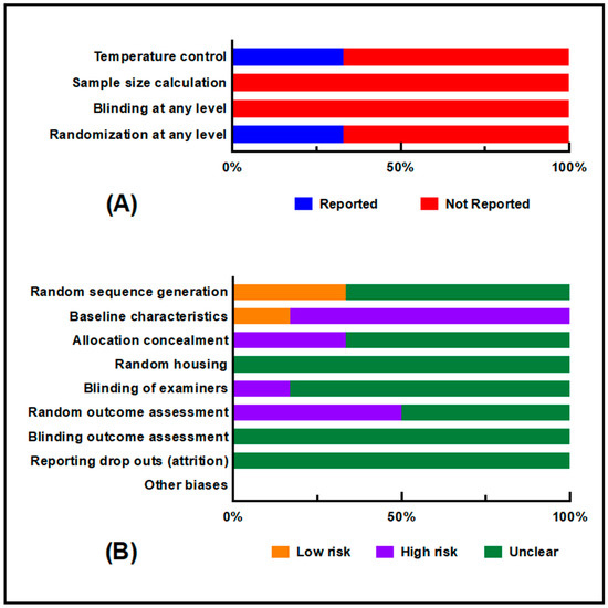 The results of the risk of bias [49] assessment in these studies are presented in Table 1 (individual scores) and Figure 2. Randomization was only reported in two studies (33.3%) [33,46], but it was unclear whether this occurred in the other studies. Similarly, temperature controls were only reported in two studies (33.3%) [33,45]. No information on blinding or size calculations was reported in any study (Figure 2A). Therefore, the risk of bias due to random housing and blinding of the assessor was unclear. The risk of bias due to the concealment of group allocation during the experiment was assessed as high for two studies, but was unclear for the others [33,45]. A high risk of bias was assessed as insufficient information was reported for the baseline group characteristics in five out of the six studies. No information was provided regarding attrition bias in these papers. Random group allocation was reported for two studies, but was not clear in the others [33,46]. The blinding of examiners was high in one study, but unclear in the others [45].