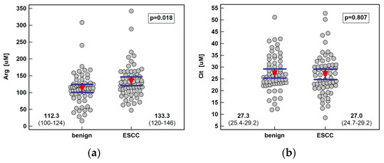 There were 16 patients with resected tumors of esophagus admitted three months postsurgery for the esophagoplasty. We compared the systemic concentration of metabolites between those patients and the ESCC group and found that ESCC patients tended to have higher arginine (124.8 µM (116–135) vs. 112.4 µM (88–125), p = 0.058) and ADMA (0.43 µM (0.40–0.44) vs. 0.38 µM (0.31–0.45), p = 0.081) than esophagoplasty patients. In turn, esophagoplasty patients were distinguished by a significantly higher concentration of SDMA than ESCC patients (0.42 µM (0.35–0.44) vs. 0.35 µM (0.33–0.38), p = 0.025).