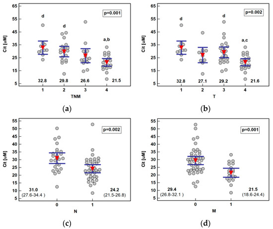 Association between systemic citrulline (Cit) concentration and ESCC advancement: (a) tumor-node-metastasis (TNM) stage; (b) primary tumor extension (T); (c) lymph node involvement (N); (d) distant metastasis (M). Data presented as the means with 95% confidence interval (red triangles with whiskers as well as numeric data) and analyzed using one-way ANOVA. a, significantly different from T1; b, significantly different from T2; c, significantly different from T3; d, significantly different from T4.