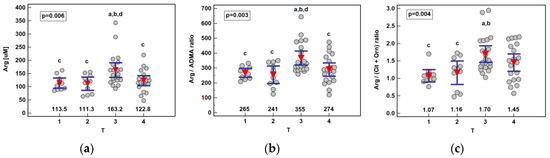 Association between systemic arginine concentration or arginine-based ratios and primary tumor extension (T) in patients with esophageal squamous cell carcinoma: (a) arginine (Arg); (b) arginine-to-ADMA ratio (Arg/ADMA); (c) arginine-to-(citrulline+ornithine) (Arg/(Cit+Orn)). Data presented as the means with 95% confidence interval (red triangles with whiskers as well as numeric data) and analyzed using one-way ANOVA. a, significantly different from T1; b, significantly different from T2; c, significantly different from T3; d, significantly different from T4.