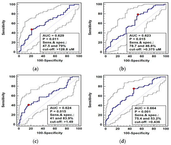 Receiver operating curve (ROC) analysis of diagnostic potential of L-arginine pathway metabolites in differentiating esophageal squamous cell carcinoma (ESCC) from benign conditions: (a) arginine (Arg); (b) asymmetric dimethylarginine (ADMA); (c) arginine-to-(citrulline+ornithine) ratio (Arg/(Cit+Orn)); (d) panel consisting of ADMA and Arg/(Cit+Orn). Graphs present ROC curve (solid curve) with 95% confidence interval (dotted curves) and an optimal cut-off value (red dot). Performance of a chance marker devoid of diagnostic power (AUC = 0.5) is indicated by a diagonal line. AUC, area under ROC curve; Sens., sensitivity; spec., specificity.