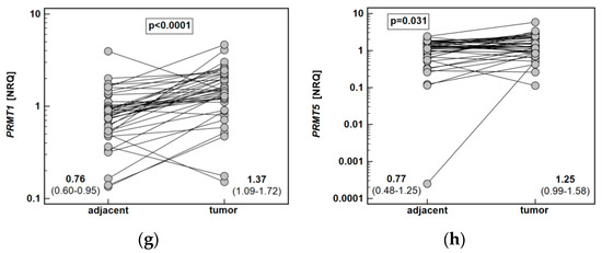 Both ARG1 (by 4.9-fold) and ARG2 (1.5-fold) were significantly downregulated in tumors as compared to adjacent tissue. The DDAH1 was downregulated as well (by 1.5-fold), while DDAH2 expression did not differ. The NOS2 (by 8.7-fold) and ODC1 (5.4-fold) expression was upregulated in tumors. Likewise, PRMT1 (by 1.8-fold) and PRMT5 (by 1.6-fold) expression in tumors was higher than in noncancerous adjacent mucosa (Figure 6).