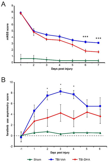 2.1. DHA Reduces Sensorimotor Deficits after TBI