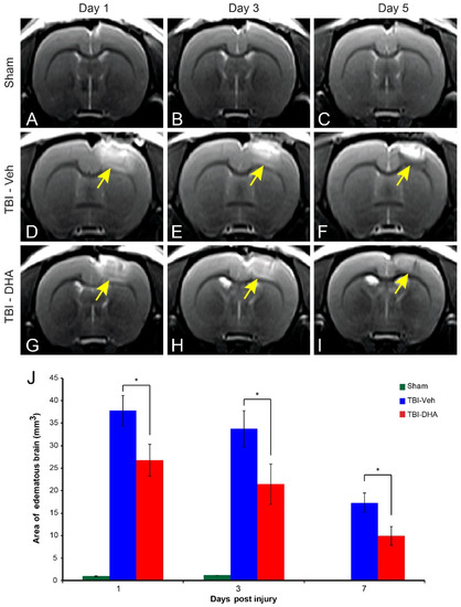 DHA-treated TBI rats exhibited less edema at the injury site than the vehicle-treated TBI rats at various time points. (A–C) In sham-operated rats, no visible edema was observed at the 3 time points studied. (D–F) vehicle-treated TBI rats exhibited large edema (yellow arrow) at day 1–7 post injury. (G–I) DHA-treated TBI rats exhibited some edema (yellow arrow) at day 1 post injury but this reduced with time. (J) Analysis of edema at the injury site revealed a significantly reduced edema in DHA-treated rats (red, n = 8) compared vehicle-treated TBI rats (blue, n = 8) at 1–7 days post injury. Edema in sham-operated rats (green, n = 7) was very limited or if any. The * indicates p < 0.05.