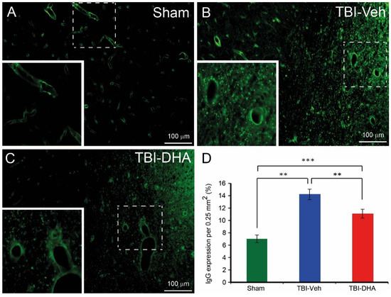 The cause of edema is the extravasation of fluid into the cerebral parenchyma due to blood–brain barrier (BBB) dysfunction [24]. To examine the extravasation level, the expression of endogenous immunoglobulin G (IgG) within the cerebral parenchyma at the peri-contusion site at 7 days post injury was analyzed [25]. There was limited IgG expression (mean ± SEM) in sham-operated rats (7.0 ± 0.6) (Figure 3A). However, Immunostaining for IgG revealed a significant increase in IgG expression after TBI injury (Figure 3B–D). In comparison between the two TBI groups, the DHA-treated rats (11.1 ± 0.7) had significantly less IgG expression compared to the vehicle-treated rats (14.2 ± 0.8) (Figure 3D).