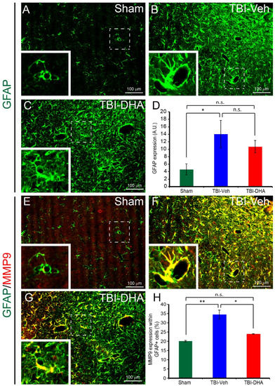 2.6. DHA Reduces Astrocytic MMP9 Expression after TBI