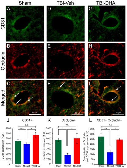 To further investigate the BBB dysfunction from CNS insult, the tight junction marker occludin and the endothelial cell marker CD31 were analyzed to test if there was an increase in leakiness due to reduction in tight junction integrity within endothelial cells after TBI. Analysis of the data showed a non-significant decrease in CD31 expression in rat brains of vehicle-treated TBI compared to sham-operated rats, but it was significantly lower than in TBI rats treated with DHA (Figure 7A–F,J). Dual immunostaining for the tight junction marker occludin and CD31 showed that there was a significant reduction in overall occludin expression (Figure 7A–I,K) and occludin expression within CD31 immunopositive cells (Figure 7A–I,L) in rat brains after TBI compared to in sham-operated rats or TBI rats post-treated with DHA.