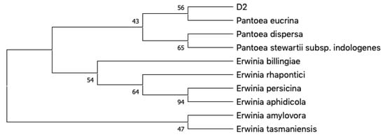 PCR was carried out in a total volume of 50 µL containing 25 µL of PCR Master Mix 2× (a ready-to-use solution containing TaqPol, buffer, MgCl2 and dNTPs), 0.2 µM of both primers 27F (5′-AGAGTTTGATCCTGGCTCAG-3′) and 1492R (5′-GGTTACCTTGTTACGACTT-3′), and 100 ng of DNA. PCR protocol is reported in Table S3. Five microliters of each PCR product were run on 1% agarose gel at 110 V for 45 min to check the quality of DNA and observed under UV light. Then PCR products were purified with the GeneAll kit according to manufacturer’s instructions and the obtained amplicons were send to Eurofins Genomics for the sequencing. Finally, the sequences were used as template for a taxonomic annotation via BLASTn tool against GenBank database, using the 16S RNA sequences collection. The contig obtained submitting the forward and the reverse sequences to Prabi CAP3 (http://doua.prabi.fr/software/cap3) was submitted to BLASTn for the affiliation analysis. Evolutionary analyses involved ten nucleotide sequences, our D2 strain along with nine close matching entries according to BLASTn, and were conducted in MEGA X []. A phylogenetic tree was inferred using the neighbor-joining method []. The evolutionary distances were computed using the Kimura 2-parameter method [] and are in the units of the number of base substitutions per site. All ambiguous positions were removed for each sequence pair (pairwise deletion option). Bootstrap values were calculated with 1000 resamples.