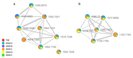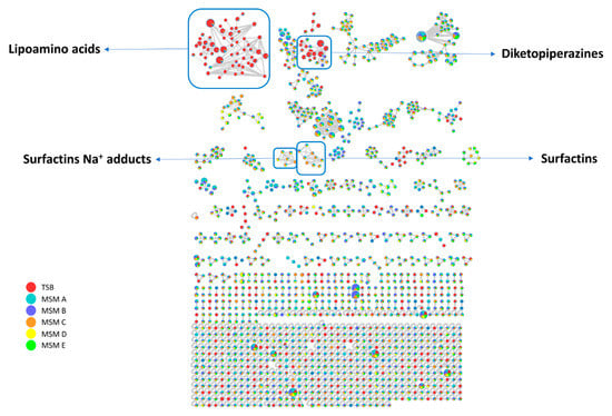 In this way, a complex web of nodes grouped in several clusters was obtained (Figure 2). Each node represents an ion found in at least one of the growth cultures, different colors are used to define their presence in different growth media, the edges size among different nodes are directly dependent on their fragmentation spectra similarity (cosine score), while the node size is directly proportional to the precursor ion intensity (sum precursor intensity). This visualization provides a scheme of the different metabolites production in the specific conditions (Figure 2).