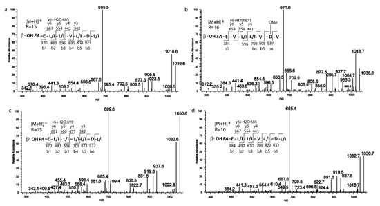 The second isomer at m/z 1050.7 (Figure 4d) showed a fragmentation pattern compatible with the substitution of Leu/Ile in position 4 with a Val and a fatty acid chain with 16 carbons (C16 β-hydroxyl fatty acid chain-Glu1-Leu/Ile2-Leu/Ile3-Val4-Leu/Ile5-Asp6-Leu/Ile7 b+: 937; 822; 709; 610; 497; 384—y+: 667 (+H2O, 685); 554; 441) []. Based on fragmentation profile, the three species at m/z 1064.7 1078.7, 1092.7, (Figure 5a–c) could be assigned as C16, C17 and C18 β-hydroxyl fatty acid homologs with the same peptide moiety, the C18 β-hydroxyl fatty acid isoform is here described for the first time [].