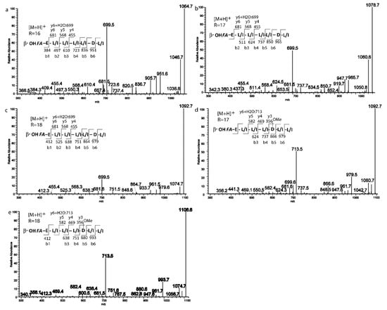 Finally, two homologs with Glu1-Leu/Ile 2-Leu/Ile3-Leu/Ile4–OMeAsp or Glu5-Leu/Ile6-Leu/Ile7 as aminoacidic sequence and a C17 and C18 β-hydroxyl fatty acid chain were found to be ascribable to the ions with m/z at 1092.7 and 1106.7 (Figure 5d,e) [,].