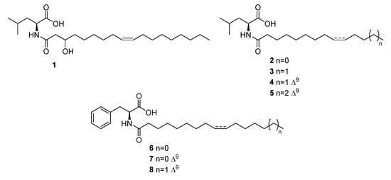 Through NMR and MS analysis and by comparison with literature data [] Compounds 6, 7 and 8 were identified as N-palmitoyl-l-phenylalanine, N-palmitenoyl-l-phenylalanine and N-oleyl-l-phenylalanine, respectively. N-palmitenoyl-l-phenylalanine (7) was already isolated from Pantoea sp., whereas Compounds 6 and 8 were obtained in the same study by synthesis []. The configuration of the double bond in the acyl chain of 7 and 8 was assigned as Z on the basis of the 13C NMR chemical shifts of allylic methylenes, whereas the L-configuration of the phenylalanine residue was assigned by comparison of the experimental positive optical rotation data with those reported in the literature [].