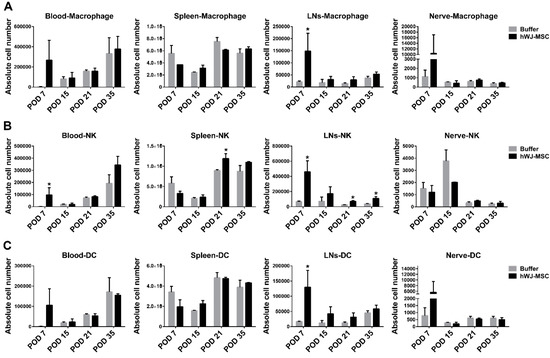 Effects of human Wharton’s jelly-derived mesenchymal stem cells (hWJ-MSC) on innate immunity in sciatic nerve-injured mice. (A–C) The absolute number of macrophages, natural killer cells (NKs), and dendritic cells (DCs) in blood, spleen, lymph nodes (LNs), and nerve-infiltrating cells. Immune cells in the two groups (n = 3) were harvested and analyzed using flow cytometry on POD7, 15, 21, and 35. The cells were stained to identify CD11b+ macrophages, NK1.1+ NKs, and CD11c+ DCs. The statistical data were represented as the mean ± SD. * p < 0.05.