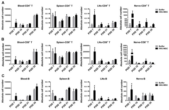 Effects of hWJ-MSC on adaptive immunity in sciatic nerve-injured mice. (A–C) The absolute number of CD4+ T, CD8+ T, and B cells in blood, spleen, LNs, and nerve-infiltrating cells. Immune cells in the two groups (n = 3) were harvested and analyzed using flow cytometry on POD7, 15, 21, and 35. The cells were stained to identify CD4+ T, CD8+ T, and CD19+ B cells. The statistical data were represented as the mean ± SD. * p < 0.05.