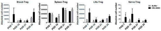 Effects of hWJ-MSC on Treg cells in sciatic nerve-injured mice. The absolute number of regulatory T cells (Tregs) in blood, spleen, LNs, and nerve-infiltrating cells. Tregs in the two groups (n = 3) were harvested and analyzed using flow cytometry on POD7, 15, 21, and 35. The cells were stained to identify CD4+CD25+FoxP3+ Tregs. The statistical data were represented as a mean ± SD. * p < 0.05.