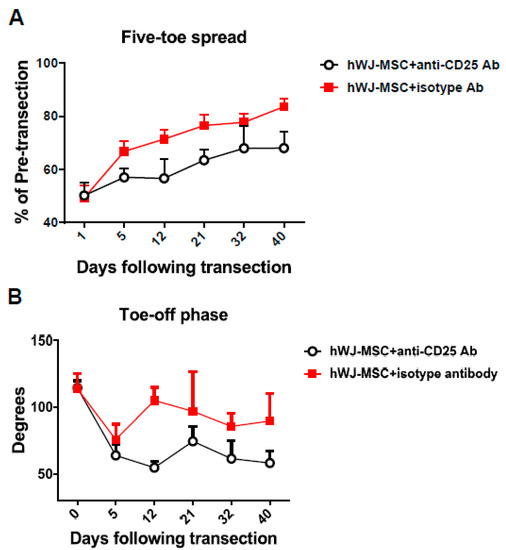 Anti-CD25 antibody administration eliminated the hWJ-MSC-mediated functional recovery in hindlimbs. (A) An anti-CD25 antibody worsened the functional recovery of the five-toe spread reflex. hWJ-MSC (5 × 105) in 50 μL were added to the space created in the musculature of each mouse. Progressive chart of the percentage of the pre-transection five-toe spread distance measured over time after the division of the sciatic nerve in the anti-CD25- and isotype-treated groups. The differences between the mean ± SD of the two groups were significant (p value < 0.05, one-way analysis of variance (ANOVA); anti-CD25 vs. isotype control, p = 0.01; Tukey’s test). The average five-toe spread in the normal mouse group was 9.811 ± 0.057 mm. (B) The anti-CD25 antibody worsened gait stance and movement. The angles were measured in both groups after transection surgery. The mean ± SD values were significantly different in the two groups (p value < 0.05, one-way ANOVA; anti-CD25 vs. isotype control, p = 0.04; Tukey’s test). The average angle of the normal mouse group was 110.0 ± 0.72.