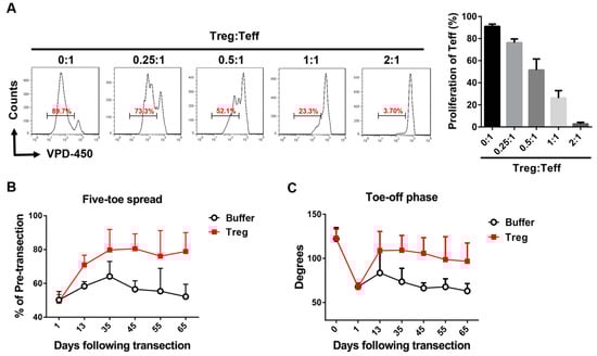 Treg administration improved the functional recovery of the sciatic nerve. (A) CD4+CD25+ Tregs (Treg) were isolated with a purity of >90% from naïve mice using a mouse CD4+CD25+ regulatory T cell isolation kit and an autoMACS instrument. CD4+CD25− effector T cells (Teff) were isolated with a purity of >90% using an autoMACS instrument. Tregs were co-cultured with VPD-450-labeled effector T cells under anti-CD3 (2 μg/mL) and anti-CD28 (2 μg/mL) stimulation for 3 days before analysis using flow cytometry. The difference between the mean ± SD values of the Treg mixture (0.25~2:1) and Teff (0:1) groups was significant in all cases (p < 0.005, Student’s t-test). (B) Tregs promoted the functional recovery of the five-toe spread reflex. Isolated Tregs (5 × 105) with a purity of >90% were added to the space created in the musculature of each mouse. Progressive chart of the percentage of the pre-transection five-toe spread distance measured over time after the division of the sciatic nerve in the buffer and Treg groups. The differences between the mean ± SD values of the two groups were significant (p value < 0.05, one-way ANOVA; Treg vs. buffer control, p = 0.02; Tukey’s test). The average five-toe spread in the normal mouse group was 9.950 ± 0.158 mm. (C) Tregs promoted gait-stance and movement improvement. The angles were measured in both groups after the transection surgery. Comparison of the mean ± SD values in the two groups revealed the presence of a significant difference (p value < 0.005, one-way ANOVA; Treg vs. buffer control, p = 0.01; Tukey’s test). The average angle of the normal mouse group was 122.5 ± 2.89.
