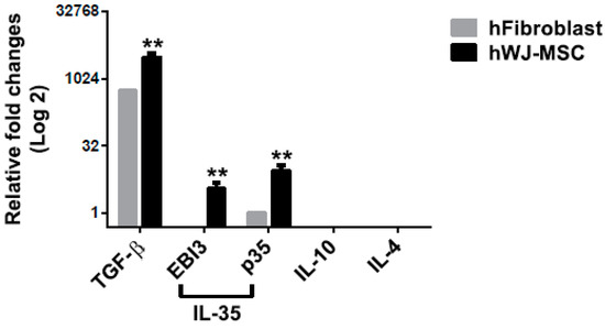 Quantification of hWJ-MSC-derived cytokine expression. The expression of mRNAs for Treg-associated cytokines, such as TGF-β, IL-10, IL-4, and IL-35 (which are composed of EBI3 and p35), in hWJ-MSC and fibroblasts, was quantified using qPCR. The levels of expression of cytokines were was normalized to that of GAPDH. The difference between the mean ± SD values of the hWJ-MSC and fibroblast groups was significant (** p < 0.005, Student’s t-test).