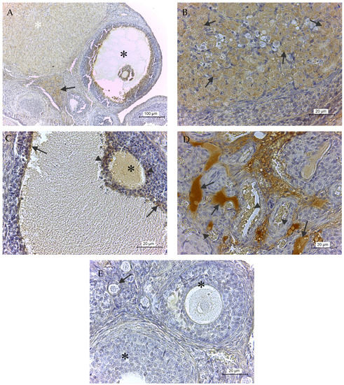 GPx8 presence in rat ovary. (A) shows an overall view of protein presence, where white asterisk means corpus luteum, the black asterisk means atretic Graafian follicle, and arrow means ovarian stroma. In detail, the protein was detected in granulosa-lutein cells (arrows) of corpus luteum (B), in the cytoplasm of the oocyte (black asterisk), in cells of corona radiata (arrowheads), in the innermost layer of granular cells (arrows) of atretic Graafian follicle (C), and in plasma in blood vessels (arrows) but not in erythrocytes (arrowheads) in (D). The enzyme was never detected in primary (arrow) and secondary follicles (black asterisk,) in (E).