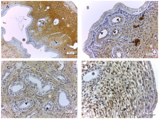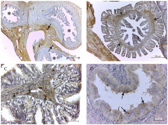 GPx8 presence in rat oviduct. (A) represents the overall view of protein presence, where the enzyme was predominantly seen in plasma in blood vessels (arrows) and extracellular matrix of fibrous tissue under the serous membrane (white asterisk). (B) shows protein presence in the infundibulum of the uterine tube (arrows). Black asterisks in (A,B) represent tubal lumen. (C) shows in detail that the enzyme in infundibulum was located in spindle-shaped fibroblasts (arrows). (D) shows the isthmic part of the uterine tube where the enzyme was present as granules in epithelial