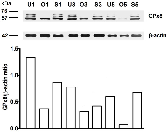 Western blot analysis of GPx8 amount in rat ovary (O), salpinx (S), and uterus (U). The number after the letter means the day of pregnancy. The main band of protein was detected at approximately 57 kDa in all examined organs. Moreover, in salpinx and uterus, two additional bands of higher size were detected. Densitometry, expressed as a ratio of GPx8 to β-actin, revealed that the highest amount of GPx8 enzyme was on D1 in the ovary (0.37), salpinx (0.87), and uterus (1.34). The amount of GPx8 in the ovary linearly decreased from D3 (0.32) to D5 (0.073) and similarly in the uterus (from 0.78 on D3 to 0.60 on D5). On the other hand, the lowest amount of protein in salpinx was observed on D3 (0.42), while it slightly increased on D5 (0.68).