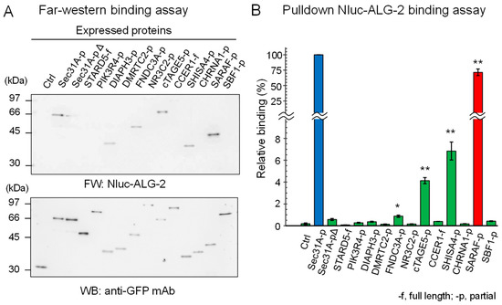 HEK293 ALG-2KD cells were transfected with each expression plasmid encoding the respective SGFP2-fused protein. After 24 h, harvested cells were lysed at 4 °C with lysis buffer HKM (20 mM HEPES-NaOH, 142.5 mM KCl, 1.5 mM MgCl2) containing 0.2% Nonidet P-40, protease inhibitors (0.2 mM phenylmethylsulfonyl fluoride, 3 μg/mL leupeptin, 1 μM E64, 1 μM pepstatin, 0.1 mM pefabloc), and 10 μM EGTA for 30 min and then hand sonicated three times for 10 s each time (UR-20P, TOMY SEIKO, Tokyo, Japan). The cleared cell lysates obtained by centrifugation at 10,000× g for 10 min were used for immunoprecipitation by incubation with rabbit anti-GFP pAb overnight followed by incubation with Protein G magnetic beads (Dynabeads® protein G, Thermo Fisher Scientific, Waltham, MA, USA) for 1 h. Collected magnetic beads were washed with buffer HKM containing protease inhibitors and EGTA. Aliquots of the suspensions of beads were subjected to Far-Western (FW) blotting and pulldown-binding assays essentially as described previously [53]. The membrane was incubated with 1 mL of coelenterazine h solution (20 μg/mL) in TBS containing 100 μM CaCl2, and the luminescence signal was detected with a LAS-3000mini lumino-image analyzer (FUJIFILM, Tokyo, Japan).