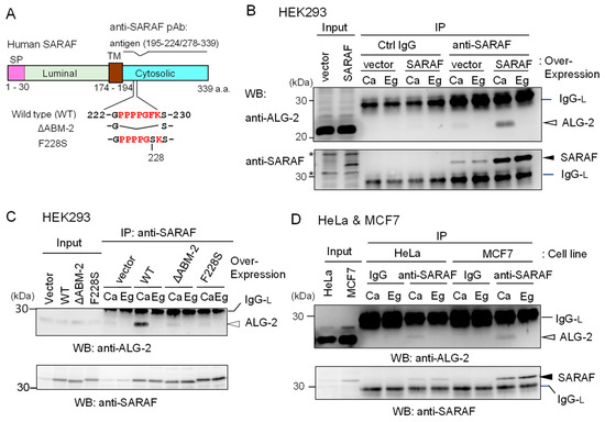To investigate whether ALG-2 interacts with SARAF in human cells, we performed co-IP assays using respective specific antibodies. Since a commercially available anti-SARAF pAb did not work in our study, we prepared antisera raised in rabbits using the GST-fused SARAF CytD lacking a portion of the sequence including the ALG-2-binding motif (Figure 2A).
