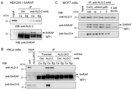 To further confirm specific interaction between ALG-2 and SARAF, reciprocal co-IP was performed using lysates of HEK293 cells stably overexpressing untagged SARAF. As shown in Figure 3A, WB signals of SARAF were detected for the IP products with anti-ALG-2 mAb in the presence of 100 μM CaCl2 (Ca) but not in the presence of 5 mM EGTA (Eg). IP with control mouse IgG (Ctrl) gave no specific signals for ALG-2 or SARAF, confirming specific Ca2+-dependent interaction between ALG-2 and SARAF in the HEK293 cell lysates. To detect interaction between endogenous ALG-2 and SARAF proteins, anti-ALG-2 mAb was used for IP with lysates from HeLa cells and, for a negative control, from ALG-2 knockout (ALG-2KO) HeLa cells that had been established previously by the CRISPR-Cas9 system [27]. As shown in the top panel of Figure 3B, WB signals of anti-ALG-2 rabbit pAb were detected for the IP products with anti-ALG-2 mAb obtained from parental HeLa cells but not from ALG-2KO cells, indicating specificity of the antibodies. WB signals of SARAF were detected for the IP products from parental cells obtained in the presence of CaCl2 (Ca) but not in the presence of EGTA (Eg) (middle panel). ALG-2KO cells gave no WB signals of SARAF in the IP products obtained under both conditions. WB signals of Sec31A, analyzed as a positive control, showed similar results (bottom panel). Figure 3C shows the Ca2+-dependency of ALG-2 interaction with SARAF using MCF7 cell lysates. Addition of CaCl2 to the cell lysates was not necessary for the interaction, but inclusion of 5 mM EGTA caused loss of the interaction. This fact suggests that Ca2+ derived from the cells and/or a trace of Ca2+ contaminating the lysis buffer was sufficient for the interaction and that deprivation of Ca2+ leads to dissociation of the SARAF/ALG-2 complex formed inside cells.