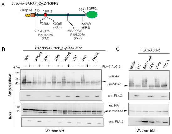 We expressed an epitope-tagged CytD (StrepHA-SARAF_CytD-SGFP2) and its various mutants in HEK293 cells and performed Strep-pulldown assays. Proteins bound to StrepTactin-immobilized magnetic beads (Strep-pulldown) were subjected to WB with anti-ALG-2 pAb (Figure 4B, upper panel) and with anti-HA mAb (lower panel). A strong WB signal of ALG-2 was detected in the pulldown products of WT StrepHA-SARAF_CytD-SGFP2. WB signals were below the detectable level in the region 2 mutant (Δ2, equivalent of ΔABM-2) and other deletion mutants, indicating that the ABM-2 sequence represents a single major ALG-2-binding site in SARAF.