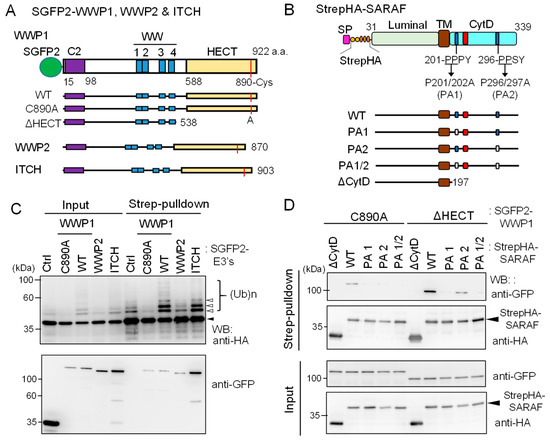A protein-protein interactome database obtained by high throughput affinity-capture mass spectrometry (MS) [30] suggests that SARAF interacts with WWP1 and ITCH (also named AIP4), members of WW-domain-containing NEDD4 family E3 ligases [23,31]. Although the degree of ubiquitination of SARAF is overestimated by WB of Strep-pulldown products due to the aforementioned post-cell lysis enzymatic reactions, WWP1 and ITCH are potential enzymes that physiologically catalyze ubiquitination of SARAF inside the cells. To investigate in-cell ubiquitination, we co-expressed StrepHA-SARAF with SGFP2-fused WWP1, WWP2 and ITCH (schematic diagrams presented in Figure 7A,B) and performed Strep-pulldown assays after lysing the cells with a buffer containing 5 mM EDTA and 10 mM NEM, which were demonstrated to block ubiquitination during the pulldown procedure (Figure 6 and Supplementary Figure S3).