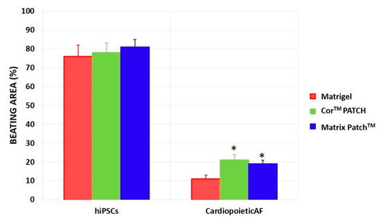 Percentage of dish area of hiPSC- and CardiopoieticAF-derived CMs that presented spontaneous beating foci after 15 days of differentiation in Matrigel® (red), CorTM PATCH (green), or Matrix PatchTM (blue). hiPSC-derived CMs were lower compared to CardiopoieticAF-derived CMs differentiated on the CorTM PATCH and the Matrix PatchTM, compared to Matrigel®. The graphs show the mean ± SD of five independent experiments; * indicates statistically differences (p < 0.05) of the CorTM PATCH or the Matrix PatchTM culture vs. the same cells cultured in Matrigel®.