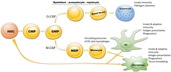 Myeloid cells differentiate from hematopoietic stem cells (HSC), represent the majority among immune cells and include monocytes, macrophages, DC and granulocytes []. HSC differentiate into common myeloid progenitors followed by granulocyte-macrophage progenitors (GMP) (Figure 1) []. Granulocytes (neutrophils, basophils and eosinophils) are developed from GMP under the influence of granulocyte colony-stimulating factor (G-CSF) through the stages of myeloblasts, promyelocytes, myelocytes, metamyelocytes and band cells. Monocytes and DC develop from GMP via monocyte/macrophage and DC progenitors induced by the macrophage colony-stimulating factor (M-CSF) [].