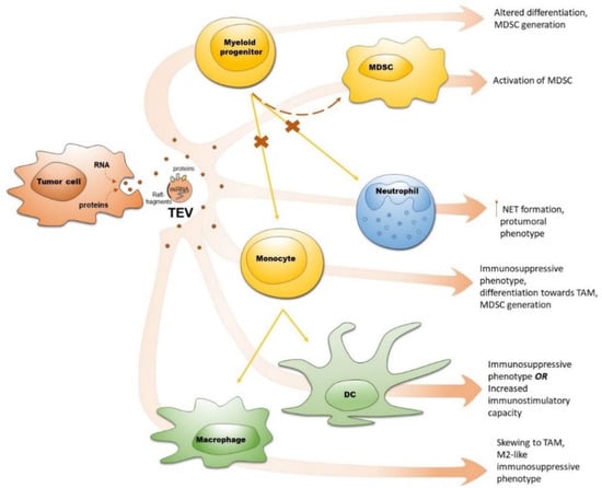 DC are terminally differentiated myeloid cells that present antigens to T cells and play a pivotal role in crosslinking innate and adaptive immunity []. During normal hematopoiesis, DC originate from HSC, whereas under inflammatory conditions, they arise from monocytes [,]. DC need a contact with bacteria, viruses or damaged tissues to be activated and can promote the differentiation of naïve T cells, inducing an immune response []. Mature DC infiltrate tumors and recruit anti-tumor effector immune cells []. However, in cancer, VEGF, M-CSF, IL-6, adenosine and hypoxia accumulated in the tumor microenvironment affect DC functions, leading to the enrichment of immature, functionally incompetent DC []. This results in a weak stimulation of the anti-tumor immune response and accumulation of immunosuppressive MDSC []. In contrast to monocytes, which are more likely exposed to TEV in the circulation, DC contact these vesicles in the tumor microenvironment and draining lymph nodes [,,].