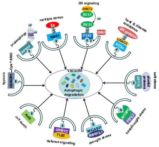 Misfolded and damaged proteins under various stress conditions are highly toxic to the cells. Plants develop highly sophisticated and efficient strategies to repair, refold, or degrade these damaged proteins. Protein aggregation occurs when chaperone-mediated refolding and/or proteasome degradation are overwhelmed by an excessive amount of misfolded proteins under various stress conditions [48]. The clearance of stress-induced ubiquitinated proteins aggregates and/or damaged organelles via selective autophagy is a common strategy for plants to tackle various stresses.