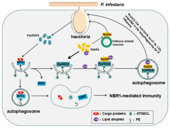 It has been shown that the RXLR (Arg-X-Leu-Arg)-type effector secreted from Phytophthora infestans, PexRD54, can suppress NBR1-mediated defense through out-competing NBR1 for ATG8CL binding [40]. PexRD54 contains an AIM and has a higher binding affinity for the ATG8CL than NBR1 and as a result, PexRD54 out-competes the NBR1 for ATG8CL binding and abrogates the NBR1-mediated degradation of defense-related cargoes [40] (Figure 2). Interestingly, during infection, the host–microbe interface is a hotspot for autophagosome biogenesis, and the autophagosomes are diverted toward the haustoria [112]. However, the reason behind this is not understood. Recently, it has been revealed that PexRD54 imitates starvation conditions and serves as a receptor for recruiting the small GTPase Rab8a with a role in basal resistance against P. infestans, and the lipid droplets (LDs) associated with Rab8a to form a distinct LDs-Rab8a-PexRD54-ATG8CL autophagosomes [113] (Figure 2). As a result, the Rab8a is trapped inside the autophagosomes and the Rab8a-mediated basal immunity is pacified [113] (Figure 2). Furthermore, instead of targeting to vacuole for degradation, the LDs-Rab8a-PexRD54-ATG8CL autophagosomes are diverted to the haustorial interface to supply the lipids required for the extrahaustorial membrane (EHM) and other nutrients engulfed in the autophagosome for the benefit of P. infestans [113] (Figure 2). These findings demonstrate that that the pathogen has evolved to create an effector to counteract the host defense via hijacking host autophagy machinery.