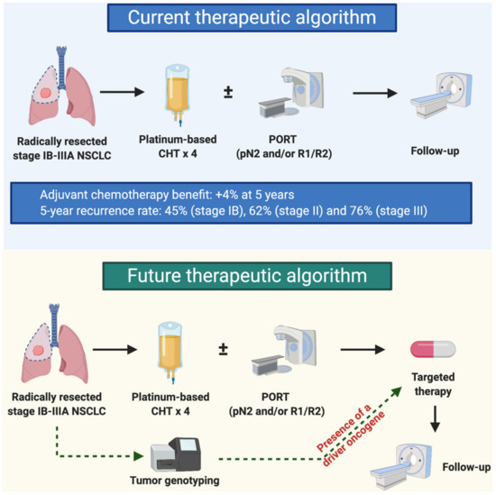 Potential role of targeted therapies in the adjuvant setting. Post-operative platinum-based chemotherapy (CHT) in stage IB-IIIA resected non-small-cell lung cancer (NSCLC) has been associated with a 4% survival benefit at 5 years [7]. According to the Lung Adjuvant Cisplatin Evaluation (LACE) study, 5-year recurrence rates range from 45% in stage IB to 76% in stage III after adjuvant chemotherapy [8]. Post-operative radiotherapy (PORT) is currently recommended in patients with pathologic N2 (pN2) disease and in those with microscopic (R1) or macroscopic (R2) residual disease.