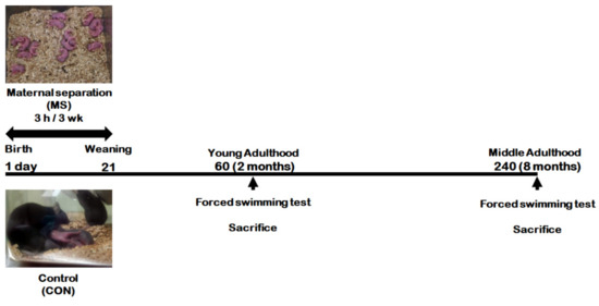 Litters from dams were divided randomly to control and MS groups. Pups from MS groups were separated from the dam for 3 h daily from PND 1 to PND 21. After separation, the pups were returned to their home cage and to their dam. Pups from control groups remained undisturbed with their dam. Male mice were examined at two adult ages (PND 60 in young adulthood, and PND 240 in middle adulthood)—Young adult control mice (CON group) and young adult MS mice (MS group) in young adulthood; middle-aged control mice (CON group) and middle-aged MS mice (MS group) in middle adulthood (Figure 1).