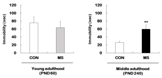Effects of maternal separation (MS) on depression-like behavior in young and middle adulthood. Animals with MS and their age-matched controls were tested in young (PND 60) and middle (PND 240) adulthood using the FST. Data are expressed as the mean ± SEM (n = 7–13/group, ** p < 0.01, unpaired Student t-test).