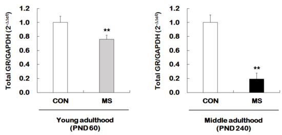 Age-dependent changes in total glucocorticoid receptor (GR) expression following MS exposure. Levels of total GR mRNA were analyzed in young adulthood (PND 60) and middle (PND 240) adulthood mice exposed to MS using qRT-PCR. All quantities were normalized to GAPDH. Data are expressed as values relative to the CON group using the 2−△△ct method, and represent the mean ± SEM (n = 10–13/group, ** p < 0.01, unpaired Student t-test).