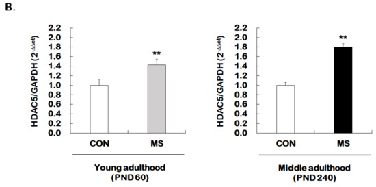 Age-dependent changes in the level of histone H3 acetylation at the GR promoter 17 and HDAC5 expression following MS exposure. (A) ChIP assays were used to measure the level of acetylated histone H3 (Acetyl-H3) at the GR promoter 17 in the hippocampus using an antibody to Acetyl-H3. Data were normalized to input DNA (n = 10–13/group). (B) The HDAC5 mRNA level in the hippocampus was measured using qRT-PCR. All quantities were normalized to GAPDH (n = 9–13/group). These levels were analyzed in young (PND 60) and middle (PND 240) adulthood, respectively. Data were expressed as values relative to the CON group using the 2−△△ct method and represent the mean ± SEM (* p < 0.05, ** p < 0.01, unpaired Student t-test).
