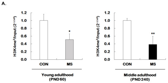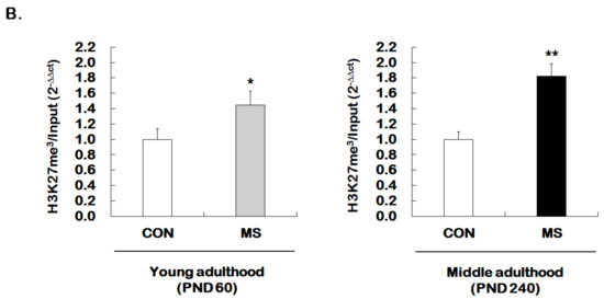 Age-dependent changes in the levels of histone H3 methylation at the GR promoter 17 following MS exposure. ChIP assays were used to measure the level of acetylated histone H3 trimethylated K4 (H3K4me3, A) and K27 (H3K27me3, B) at GR promoter 17 in the hippocampus using antibodies to H3K4me3 and H3K27me3. These levels were analyzed in young (PND 60) and middle (PND 240) adulthood, respectively. Data were normalized to input DNA and are expressed as values relative to the CON group using the 2−△△ct method, and represent mean ± SEM (n = 9–13/group, * p < 0.05, ** p < 0.01, unpaired Student t-test).