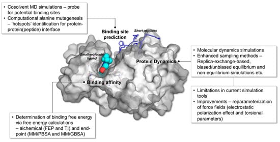 The advancement in computing architecture and algorithms has spurred the extensive growth of MD simulation tools over recent decades. Architectural developments of computers resulted in the invention of graphics processing units (GPUs) and parallel computing while the refinement of algorithms leads to a more accurate rendering of the potential energy surface (PES) of the system and better conformational sampling. The combination of both facets of computing has enabled a more reliable prediction of the physical properties of proteins as well as the observation of biologically relevant protein structures at the atomic level, a feat that requires timescales beyond milliseconds, expanded length scales, and enhanced sampling techniques that facilitate high free energy barrier crossing []. The burgeoning use of MD simulation as a main tool in the computational studies of proteins as well as a complementary machinery in experimental studies has propelled actions to improve various aspects of MD simulations, warranting better predictive power and more reliable in silico analysis of protein structures, dynamics and functions. In this review, we will provide an overview of simulation strategies, mainly all-atom MD simulation and enhanced sampling methods, used to examine protein structures and dynamics to facilitate the understanding of mechanisms regulating biological processes namely, protein-ligand binding and protein-protein association. The capitalization of the predictive power of MD simulation and enhanced sampling methods to determine binding free energies as well as potential binding sites are also discussed. Furthermore, limitations of current simulation techniques as well as improvements made to optimize the accuracy of MD simulation/enhanced sampling methods are highlighted. Figure 1 reflects a summary of the topics discussed in this review.