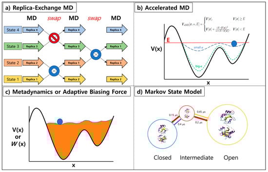 Overview of enhanced sampling methods: (a) replica-exchange MD simulation, (b) accelerated MD, (c) metadynamics or adaptive biasing force, and (d) Markov state model.