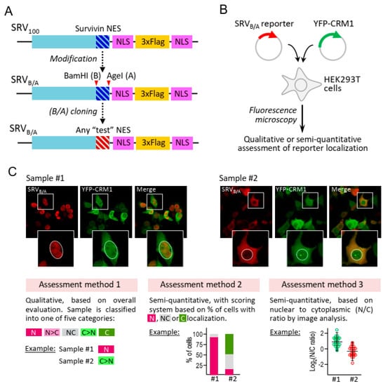 Cellular assays based on the localization of reporter proteins are a common approach to evaluate nuclear export activity of putative NES motifs. A prominent example is the Rev(1.4)-GFP nuclear export assay [22]. In this widely used assay (cited 330 times, according to the Scopus citation database accessed in May 2020), export activity of candidate NESs is determined by their ability to induce cytoplasmic relocation of the otherwise nuclear Rev(1.4)-GFP reporter. We have previously shown that another cellular assay, based on a reporter termed SRV100, can be used to compare the export activity of different CRM1 variants [19]. The original SRV100 reporter contained the NES of survivin but, as recently described [20], we have subsequently modified the plasmid encoding SRV100 to introduce two novel restriction sites (BamHI/AgeI) that allow replacing survivin NES by any other NES (Figure 1A). Importantly, this modified reporter, called SRVB/A, was designed in such a manner that candidate NES motifs can be easily shuttled to and from the Rev(1.4)-GFP reporter (Figure 2A).