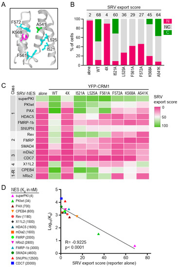 SRVB/A reporters containing each of these 14 NES motifs were either transfected alone or co-transfected with YFP-CRM1-encoding plasmids into HEK293T cells. Besides the five mutants indicated above, wild-type YFP-CRM1 and the previously studied A541K and 4X mutants were included in the analysis. All in all, 112 different combinations of SRV-NES reporter/CRM1 mutant (plus each reporter alone) were tested in these experiments. The percentage of cells where the reporter was located exclusively/mainly in the nucleus (N), the cytoplasm (C), or was similarly distributed between nucleus and cytoplasm (NC) was determined by counting at least 200 cells per sample (assessment method 2, detailed in Figure 1). As a representative example, the results obtained with the SRVB/A reporter containing X11L2 NES are shown in Figure 3B, and the graphs for all the NES reporters are presented in Supplementary Figure S2. From these semi-quantitative data, a nuclear export score (hereafter referred to “SRV export score”), ranging between 0 (no export) and 100 (complete export) was derived, as detailed in the Methods section. The SRV scores for the full set of experiments are represented as a heat map in Figure 3C.