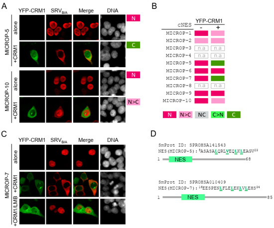 Human micropeptides were retrieved from the SmProt database, a manually curated repository of small proteins detected or predicted in eight different species [33]. In silico prediction of putative NES motifs in the amino acid sequences of micropeptides was carried out with Wregex and NESmapper, as described above (no attempt to predict “minus” NES motifs was made in this case). Ten of the highest-ranking candidates (Supplementary Table S3) were selected and seven were successfully cloned into the SRVB/A reporter for experimental testing (two representative examples are shown in Figure 5A). When expressed alone into HEK293T cells, the localization of all the reporters (determined using assessment method 1) was exclusively nuclear (N), except for SRV-MICROP-2 that showed also a faint cytoplasmic signal (N > C localization) (Figure 5B). When co-expressed with YFP-CRM1, SRV-MICROP-5 and SRV-MICROP-7 reporters fully relocated to the cytoplasm (C localization), SRV-MICROP-1 and SRV-MICROP-10 showed a minor relocation to the cytoplasm (N > C localization) and SRV-MICROP-6 and SRV-MICROP-9 remained in the nucleus. Unexpectedly, the partial cytoplasmic localization of SRV-MICROP-2 was not increased by co-expression with YFP-CRM1, suggesting that this motif may mediate CRM1-independent export or retention in the cytoplasm, rather than CRM1-mediated nuclear export. These findings identify at least two clearly active NES motifs (MICROP-5 and MICROP-7) in human micropeptides. To further confirm that these motifs are exported via CRM1, HEK293T cells co-expressing SRV-MICROP-5 or SRV-MICROP-7 with YFP-CRM1 were treated with the CRM1 inhibitor Leptomycin B (LMB). Blockade of CRM1-mediated export readily prevented cytoplasmic relocation of SRV-MICROP-7 (Figure 5C) and SRV-MICROP-5 (Supplementary Figure S3) reporters. To our knowledge, these sequences (Figure 5D) represent the first two functional CRM1-dependent NESs identified in human micropeptides.