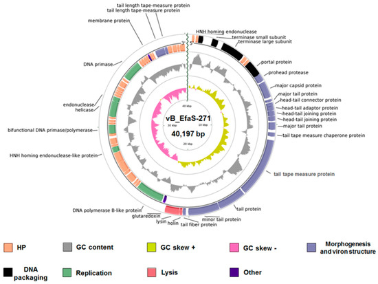 Circular map of the bacteriophage vB_EfaS-271 genome created using the BRIG platform. The innermost circle indicates GC content, where yellow and pink correspond to positive and negative GC skews, respectively. The gray ring shows the GC content. The ORFs with predicted functions are categorized into five groups: phage structure and morphogenesis (blue arrows), host lysis (red arrows), phage DNA replication (green arrows) and DNA packaging (black arrows) and others (dark blue arrows). For clarity, the hypothetical proteins (HP) are marked with orange arrows but not described on the map.