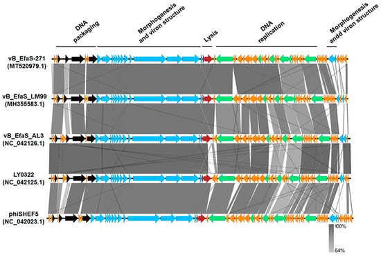 Multiple genome alignments of the vB_EfaS-271 bacteriophage and 4 other related enterococcal phages, vB_EfaS_LM99 (MH355583.1), vBEfaS_AL3 (NC_042126.1), LY0322 (NC_042125.1) and phiSHEF5 (NC_042023.1), created by using the EasyFig program. Open reading frames (ORFs) are shown as arrows to indicate the direction of transcription and are colored in accordance with their predicted functions: phage morphogenesis and virion structure (blue arrows), host lysis (red arrows), phage DNA replication (green arrows), and DNA packaging (black arrows). Orange arrows represent ORFs of unknown functions. The percentage of sequence similarity is shown as the intensity of the gray color. Vertical blocks between compared sequences indicate parts of the genome with at least 64% homology.
