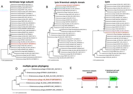 Neighbour-joining phylogenetic trees showing the phylogenetic position of vB_EfaS_271 phage (in red color) across other Enterococcus phages. Trees were constructed using PAUP * and based on: the sequence coding for terminase large subunit TerL (A), fragment of the lysin gene including sequence coding for an N-terminal catalytic domain of this protein (B) the complete sequence of the lysin gene (C), and sequences of 26 genes listed in the Supplementary Table S5 and coding for proteins of known functions (D). The reference sequences of the tested genes were collected from NCBI database. Bootstrap values > 50% calculated on the basis of 1000 resamplings are shown at the nodes. Branch lengths represented by a scale bar indicate the number of substitutions per site. Panel (E) shows domain organization of the lysin protein of the vB_EfaS_271 phage. The prediction was done with the Pfam database [61] (European Molecular Biology Laboratory, ELIXIR, Pram 33.1). Available online: http://pfam.xfam.org/ (accessed on 26 August 2020). Specific protein domains: N-acetylmuramoyl-L-alanine amidase (Amidase 2) and SH3 domain are marked with red and green colors, respectively. Numbers indicate positions of amino acids representing the beginning and end of the domain sequence.