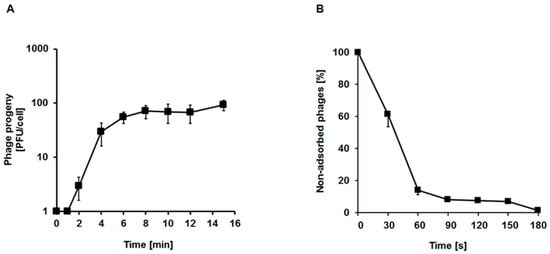 One-step growth experiments were performed only after infection of the E. faecalis 271 host, as development of the phage in the 272 strain was too slow to allow for precise determination of the measured parameters (compare Figure 5D–F). These experiments confirmed that vB_EfaS-271 develops rapidly in the 271 host cells at 37 °C. The eclipse time was as short as 2 min, and the latency period was estimated to be 8 min. The average burst size was approximately 70 progeny viruses per cell (Figure 6A). Adsorption of vB_EfaS-271 on cells of the E. faecalis 271 host was also very efficient. Over 90% of the virions were effectively adsorbed within 90 s of incubation (Figure 6B).